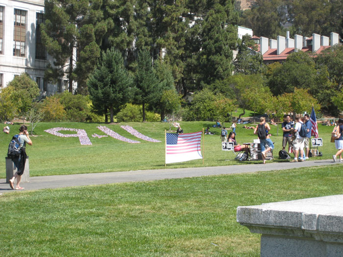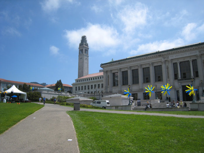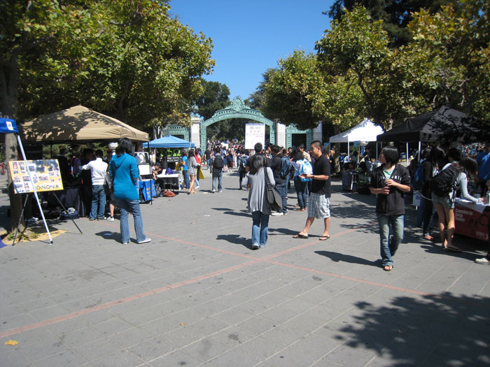 新学期(Fall Semester)が始まった時の様子を報告します。 これは大学内の中央広場(Memorial Glade)ですが、UCバークレーのシンボルカラーである青と黄色の風船が飾られています。向こうに見えるテントを拠点をして、イベントも行われていました。 ちなみにこのMemorial Gladeは、当初(1860年代)のキャンパス計画では、広場としての機能だけではなく、サンフランシスコ湾が望める軸線にもなっていました。しかしこの軸線は崩れ、現在、この広場からはサンフランシスコ湾を見ることができません。代わりに、この写真の向こうに見えるThe Campanile(別名Sather Tower)の足もとからサンフランシスコ湾が見えます。 これは大学のメインエントランスであるSather Gate前ですが、たくさんのサークル・クラブがデスクをつくって、新入生の勧誘をしていました。日本の大学と同じようなもので、とても活気があり楽しげでした。 これらの様子を見ると、やはり「新学期が始まったなあ」と感じるものですね。重要な大学の風物詩だと思います。 |