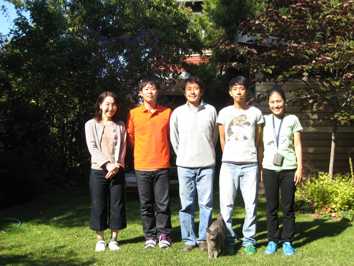 学生たちに先に報告をブログに書かれてしまったのですが、私からも学生達のバークレー訪問について簡単に報告しておきます。 9月の上旬に、志村研究室修士2年の3人(黒崎さん、島田君、松島君)がバークレーに遊びに来てくれました。今年の志村研究室は、大学院生6人が居るのですが、この3人が来てくれた訳です。 当然、歓迎しましたので皆さん楽しんでくれたと思います。 しかしちょうとベイ・ブリッジの架け替え工事があり、空港に迎えにいったりサンフランシスコを案内することができませんでした。 その代わり、バークレーを案内し、またナパにも遊びに行きました。 詳しいことは、学生たちの報告にありますので、私の印象に残ったことを二つ書きますと、 まず皆さん「よく食べた」ということです。特に生野菜サラダはたくさん食べていました。妻と話をして「これだけつくれば残るだろう」と大きな器に山盛りにしたのですが、全部食べられてしまいました。やはりカリフォルニアの野菜は美味しいのだなあと再認識しました。 もう一つは、バークレーを旅立った後に、お礼のメールをもらったのですが、その中に「平和なバークレー」と書いてあったことです。 これはバークレーの町をうまく表現したなあと感心しました。 緑が多くて、陽射しも暖かく、平和を愛する人たちが住んでいる町。 このような町を増やしていきたいものです。 その平和な町の志村邸の庭で撮影した写真です。(学生たちのブログにもほぼ同じ写真が載っていますが) よく見ると、ネコのメルセデスが手前に写っています。 平和な雰囲気が分かってもらえるでしょうか。