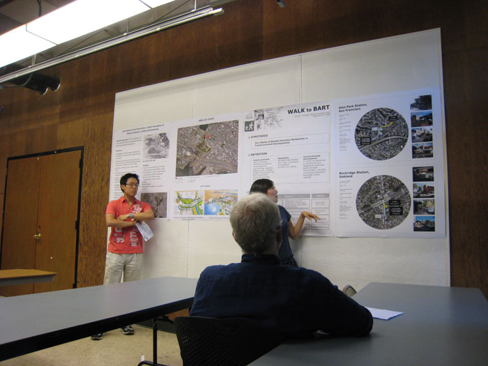 秋のセメスターでは、ピーターがアーバンデザインスタジオを担当しないということで、ピーターが担当している他の授業「Environmental Design Research Method」に時々参加しています。 この授業は、近隣単位での環境に焦点を当てていて、Livability(暮らしやすさ), Belonging(調和), Vitality(活発さ)をキーワードに、生活環境を測定する方法を身につけようとするものです。 調査と分析は仮説を立てて行います。例えば、「人口密度とVitalityは相関関係がある」、「公園のデザインとVitalityとは相関関係がある」、「商店街の店舗密度と歩行者行動は相関関係がある」などの仮説を立てて、それを証明するための調査・測定を行います。 調査は極めて定量的で、数のカウント、自動車の速度測定、騒音の測定などを道具や機材を使って行います。 データはグラフだけではなく、地図を作製し、より効果的なビジュアルな方法を用いることを推奨しています。 写真は、第1回目のテーマと仮説、調査方法に関する発表をしているところです。 学生たちは3人程度のグループをつくり、調査対象地区をバークレーやサンフランシスコから選んできます。今年は学生の数が40人以上と多く、12グループができました。 生活環境を測定して計画に結びつけることは、重要な学習です。芝浦工大では、私が担当している「地域デザイン演習」でやっていますが、しっかりしたものは、やはり大学院でやるべきでしょう。芝浦工大でもこのような授業を設けたいものです。